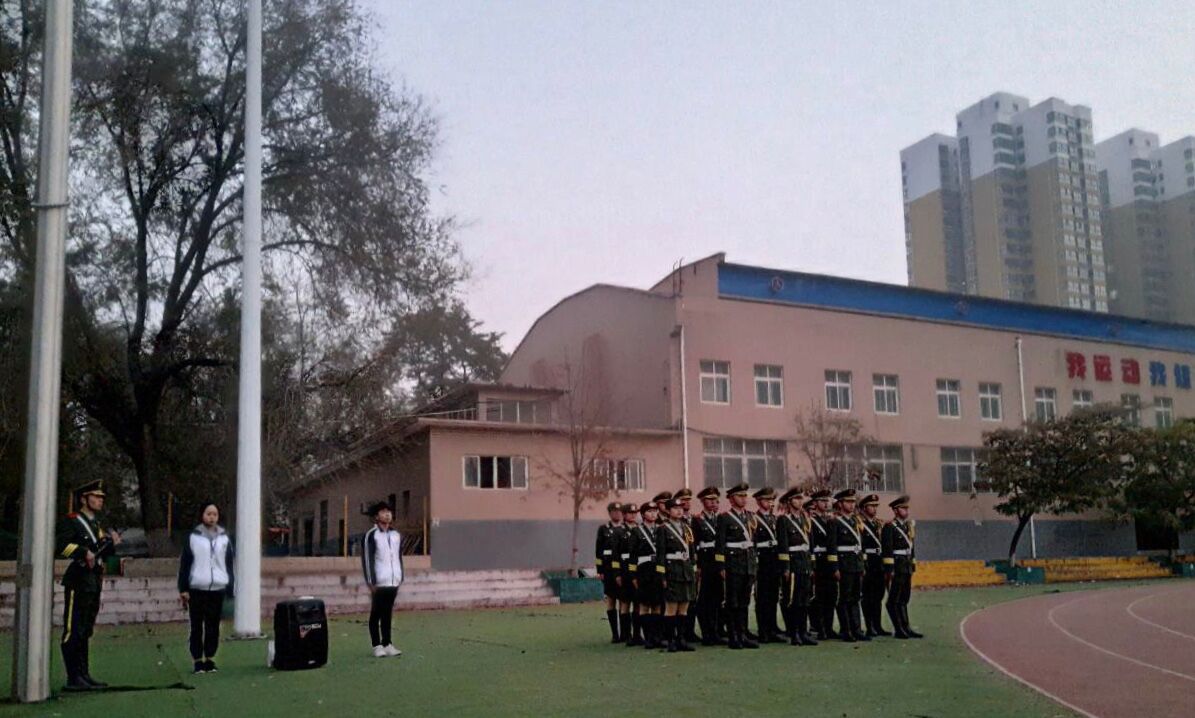 7点整,升旗仪式正式开始。在初冬的寒风中,国旗护卫队的队员们迈着坚定而有力的步伐,喊着嘹亮的口号,护送鲜艳的五星红旗走向升旗台。伴随着雄壮的国歌声,五星红旗迎着朝阳冉冉升起,全体师生面向国旗行注目礼。