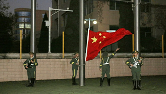 7点整,升旗仪式正式开始。在初冬的寒风中,国旗护卫队精神抖擞,迈着整齐划一的步伐护送鲜艳的五星红旗入场。五星红旗伴随着雄壮的国歌徐徐升起,全体师生面向国旗行注目礼。