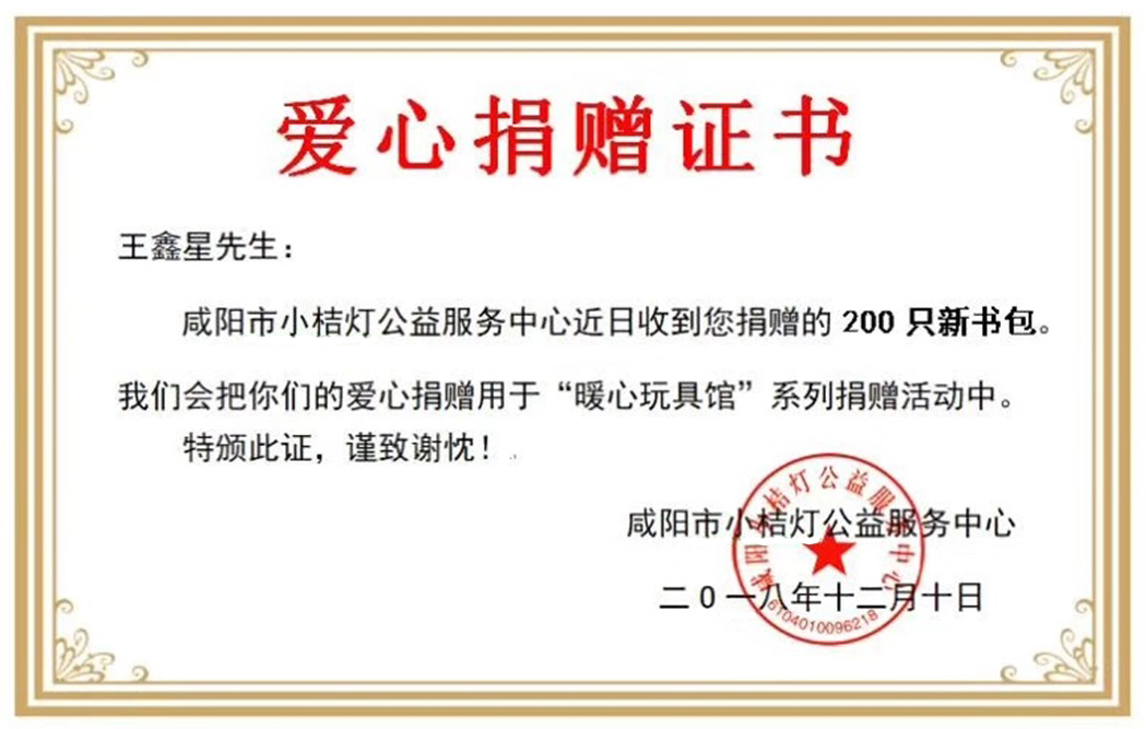 王鑫星同学出生陕西安康平利一个普通的三口之家,家里经济条件非常一般,父亲近些年身体不好,母亲常年在外打工。他从小自强独立,乐于助人,在校各方面表现优秀。为了给家庭减少负担,他还利用寒暑假外出打工,缓解家庭经济压力。据了解,王鑫星捐赠的这批书包是用自己暑假实习打工所得购买捐赠的,这批书包将全部用于小桔灯“暖心玩具馆”系列自选捐赠活动中,为更多需要的孩子带去爱心与温暖。王鑫星同学的善行义举充分体现了了当代大学生有担当、有责任的良好品质,也彰显了工院学子的风采。