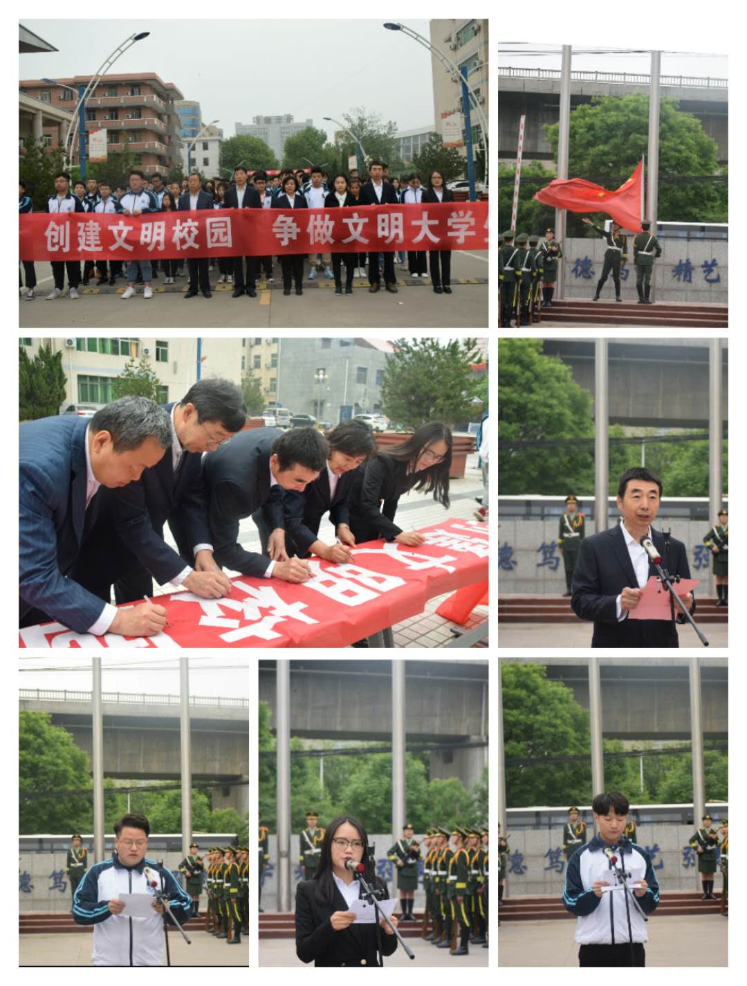 升旗仪式结束后,化工与纺织服装学院党总支副书记程建卫作题为《文明校园,从我做起》的讲话,教育每一名同学从爱学习、懂礼仪、有爱心和负责任等方面亲近文明,展现文明,实践文明,做文明学生,为创建文明校园贡献一份力量。随后,学生代表纺检1702班寇鑫同学以《创建文明校园,争做文明大学生》为题进行国旗下的演讲,号召同学们提升文明素养,用行动诠释文明之美,共筑校园文明之风。团总支副书记全佳伟同学宣读《文明校园,你我同行》倡议书,倡议同学们自觉践行“五个文明”,真正承担起文明校园建设的重任,为文明校园的建设与发展贡献自己的一份力量。最后,全体师生在明德堂前集中进行了《创建文明校园,争做文明大学生》签名活动。