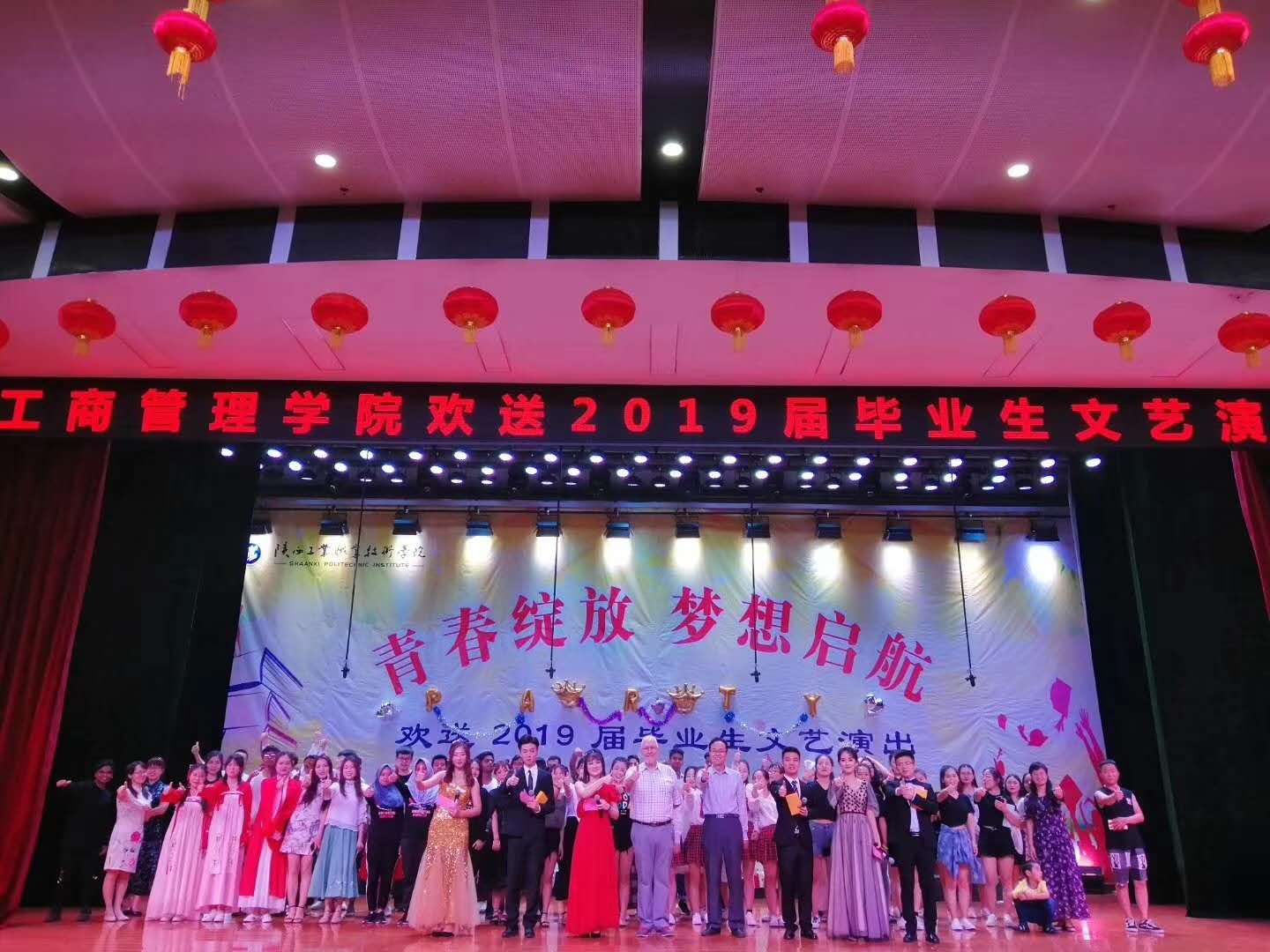 6月22日下午,工商管理学院在明德堂举办了“欢送2019届毕业生文艺演出”,参加本次活动的有工商管理学院党总支书记孙继龙、外教John Smith、工商学院教师代表以及毕业生代表共计300余人。本次演出节目均由学生自编自演,他们用舞蹈、歌曲、魔术、乐器演奏等形式多样的节目重温大学生活中的感动故事,以此祝福母校,惜别师长,见证自己的无悔青春。外教John Smith为这次演出准备了抽奖环节,他为学生们送上了自己精心挑选的礼物,以物寄情,表达祝福。本次毕业生文艺演出在一首《相亲相爱》中落下帷幕,简单的歌曲表达了毕业生对老师对同窗的深厚感情以及对未来的美好期许。