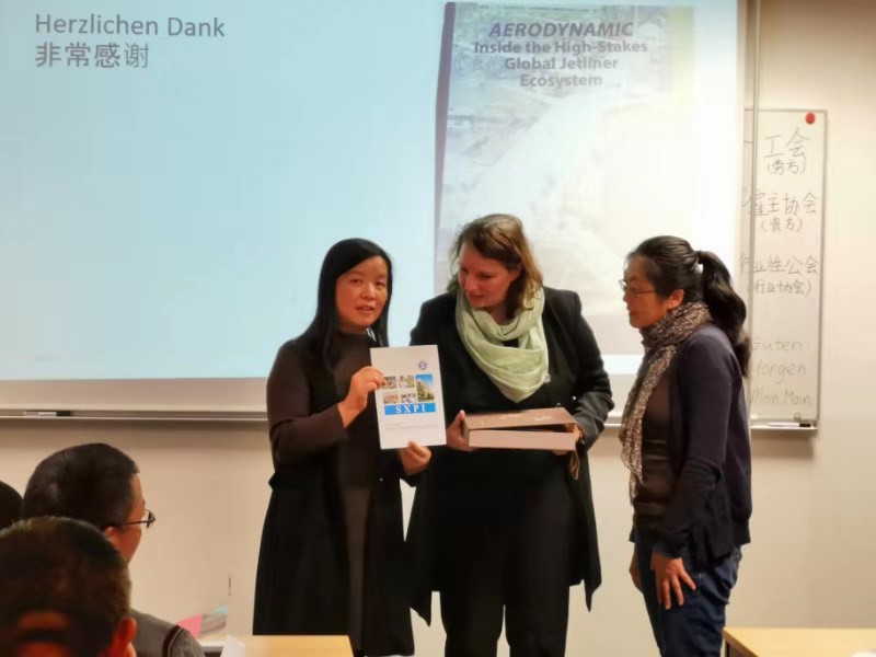 研修期间,段文洁老师深入学习了德国“双元制”职业教育框架及运行模式,剖析职业标准开发、学习领域构建和基于生产流程的教学设计,对中德职业教育进行了SWOT分析,研究了数字化智能化对职业岗位的新要求,对德国“工匠师傅”(Meister)培养的实施基础、培养过程考核标准有了深刻认识;参观了德国空客、ZAL机器人研发中心和超企业培训中心,深入课堂体会了自动化和可编程控制器、增材制造、3D打印技术在航空航天技术方面的应用、轻型机器人和移动机器人,体验了可操作性强、利用激发学生学习兴趣的可视化感知教学理念和行动导向教学法,可借鉴、应用于我院的专业教学,有利于课程改革、教学创新。期间,教育部教师司副司长黄伟、国际交流司副处长殷文和驻柏林大使馆冯一平于12月1日到海因策学院看望学员并组织了座谈,黄伟副司长勉励参培教师学习德国职业教育经验的同时,重在结合中国职业教育实际情况将所学“落地”,将“工匠师傅”的能力要求落实到教学设计、课程组织中去,创新中国特色职业教育。