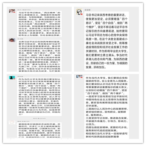 会上,党总支书记刘军旭带领大家认真学习《陕西省委学习习近平总书记来陕考察重要讲话重要指示精神》及《省委教育工委学习习近平总书记来陕考察重要讲话指示精神》,他要求教师党员要承担起教育工作的使命担当,以“立德树人”为根本任务,牢记教育者的初心和使命,增强“四个意识”,坚定“四个自信”,做到“两个维护”,为学院“双高”建设作出贡献。要求学生党员以"爱国、进步、民主、科学"的五四精神为指导,树立鸿鹄之志、勇担时代之责,在奋斗中绽放青春底色,提升综合素质,为实现中华民族伟大复兴的中国梦奋斗。同时,师生进行了热烈讨论,交流学习心得。