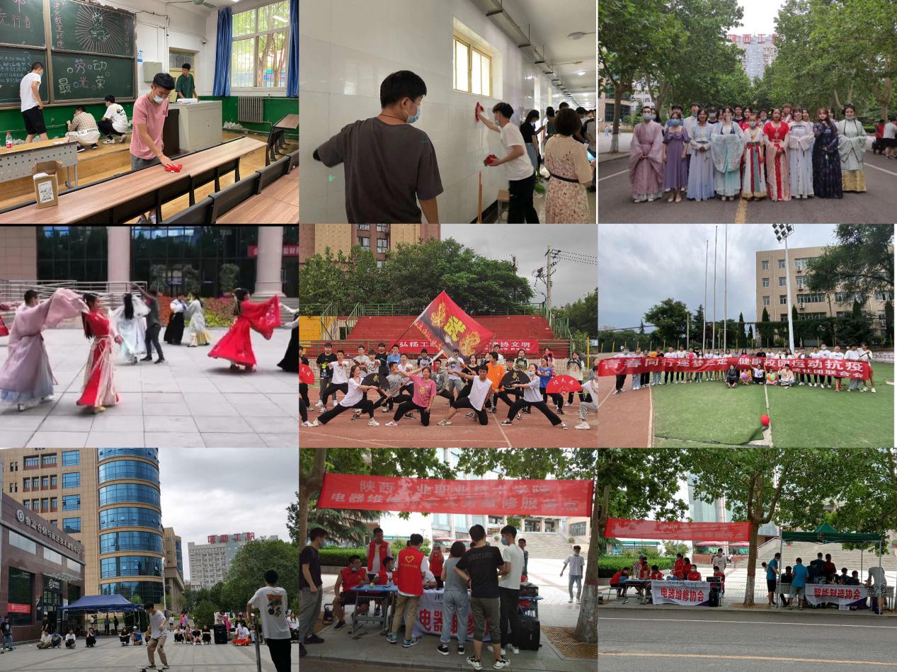 各二级学院团总支书记率先示范、亲自带领,同学们积极投身在教室净化美化劳动实践活动中,树立了当代青年学习榜样,营造了劳动光荣、团结奋进、昂扬向上的校园氛围。随着“文化端午”社团系列活动的开展,众多优秀社团以独特新颖的创意脱颖而出,汉服社社团以“端午古韵,汉服流芳”为主题,通过开场古筝演奏、诗词飞花令、手工香囊制作、汉服秀等进行了多元化、形式新颖的展示,弘扬了传统文化,传承了中华文明;武术协会以“诗情端午,活力武协”为主题,通过武术套路、长棍、散打、刀、功夫扇、双截棍等展示,树立起工院学子强身健体的形象;滑板社以“花式滑冰,放飞梦想”为主题,使工院青年再次突破自我,躁动起来;社团联合会以“青春同行逐梦三走,健康校园运动抗疫”为主题,在操场开展了乒乓球掷准、十字象限跳等趣味运动活动,充满挑战、凝聚起工院青年的心;智能制造协会在精艺楼广场前对各类工业、工程机器人进行展示,迸发出工院学子的智慧和魅力;电器维修协会想同学之所想,急同学之所急,解同学之所需,开展了校园电器免费维修活动,为疫情下的学子带来一份贴心的关怀。