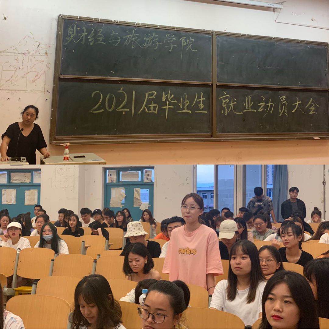 9月10日下午,财经与旅游学院在崇文西楼301召开了2021届毕业生就业动员大会,参与人员有学工办主任杜娟,2021届辅导员吕华及2021届全体非专升本毕业生共计300余人,会议由吕华主持。