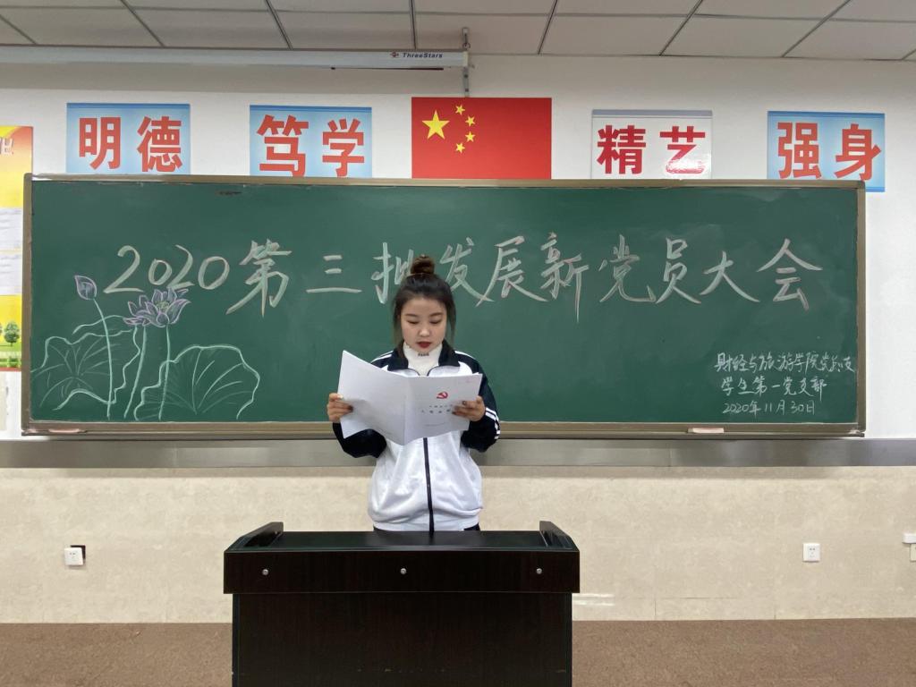 财经与旅游学院党总支学生第一党支部于11月30日下午在崇明楼806教室召开接收预备党员支部大会。此次大会旨在为党组织汇入新鲜血液,增强支部力量,学生第一党支部全体党员、入党培养联系人以及第十一期发展对象参加了本次支部大会。本次会议由支部书记罗峰同志主持。