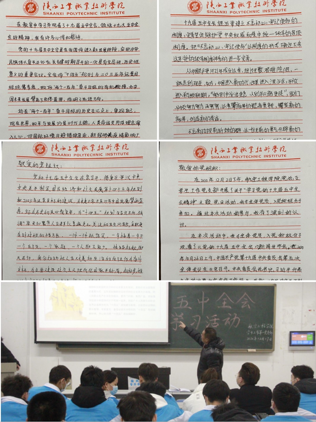 “从现在到2035年,正是我们风华正茂的时光。我们要珍惜时光,努力学好本领,为中国特色社会主义航船继续乘风破浪积蓄力量,用青春书写无愧于时代的华彩篇章。”机电1905班郑方圆说。为深入领会党的十九届五中全会精神,学生支部书记宋远社要求每位党员、积极分子活动后写一篇心得体会。