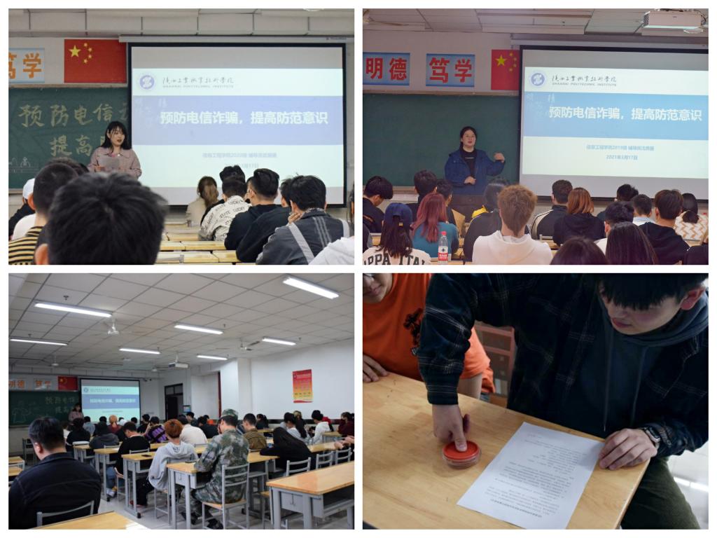 会上,年级辅导员介绍了本次会议的目的与主要内容,重点从什么是电信网络诈骗、电信网络诈骗的形式、如何防范电信网络诈骗三个方面进行详细的讲解。同时结合近年来发生在高校大学生中的真实诈骗案例,向同学们介绍了刷单诈骗、冒充客服诈骗(快递客服、电商服务)、贷款诈骗(办理信用卡、网上贷款)、买卖游戏装备诈骗(直播充币诈骗)、中奖及返现诈骗、冒充熟人(微信、QQ诈骗)诈骗等几种常见电信诈骗,以及套路贷违法犯罪行为的形式、特点,并告诫同学们如何预防和正确处置,提醒同学们遭遇此类安全性事件一定要第一时间联系学院老师,及时纠偏,将损失降到最低。会后,与会同学签署“预防电信诈骗”承诺书。