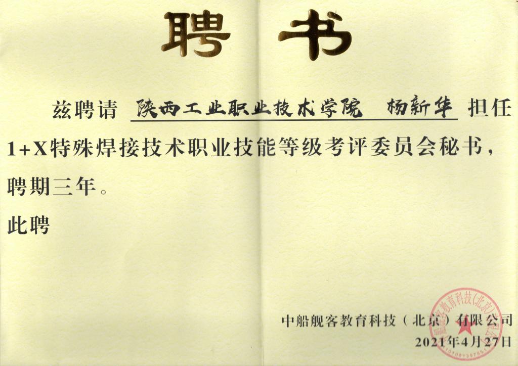 4月27日至28日,中船舰客教育科技(北京)有限公司主办的2021年中船高技术技能焊接人才培养交流会在福建船政交通职业学院(南平校区)举行,我院教师杨新华参加了会议。会议主要内容为2020年“1+X”特殊焊接技术职业技能等级认证考试经验分享、2021年“1+X”特殊焊接技术职业技能等级认证工作规划、产品质量要求决定高技术技能人才评价体系主题发言、特殊焊接技术考评委员会成立仪式等。