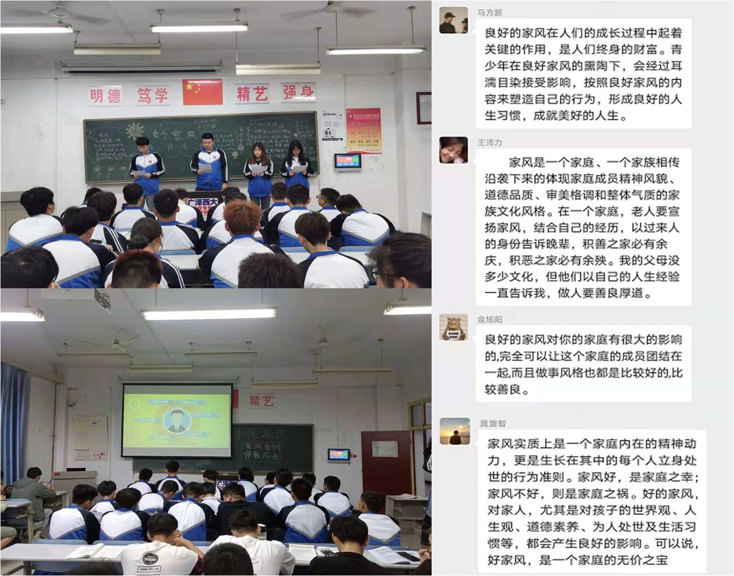 经过充分宣传动员,各班精心设计了主题板报为活动的开展营造了浓厚的氛围。同学们通过观看家风微视频、表演家风诗朗诵、分享诸如《诫子书》《颜氏家训》《曾国藩家书》《朱子家训》等古今中外流传下来的经典家风家训,多方位学习了家风的内涵和意义,深刻体悟了良好的家风家训对于个人品德修为的影响作用。活动最后,各班同学采用线上线下相结合的形式畅谈自己家的家风家训,围绕如何弘扬优良家风、校风等问题分享交流了各自的所思、所想、所感。