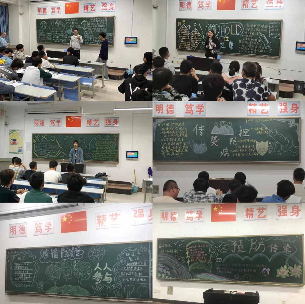活动前,各班精心设计了主题板报,营造了良好的氛围。通过各类传染病知识的讲解、鲜活的案例呈现、传染病防治常识问答等多种形式,同学们深入了解并学习了新冠肺炎、诺如病毒、流行性感冒、流行性腮腺炎、水痘、出血热、肺结核等校园传染病的预防措施、发病症状、传播途径及危害程度。活动最后,各班按照教室、宿舍卫生整治要求,及时彻底清理教室与宿舍卫生,共创健康文明的学习生活环境。