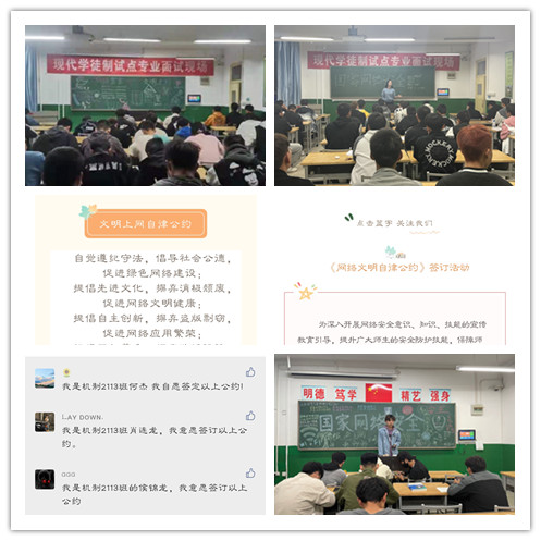 根据《关于开展2021年“国家网络安全宣传周”的通知》要求,机械工程学院开展了“共建安全绿色网络,奏响和谐网络之音”青年学生签订《网络文明自律公约》活动,并于10月24日在各班晚自习教室开展了“守护网络安全,构建和谐校园”网络安全线上“云课堂”主题班会。