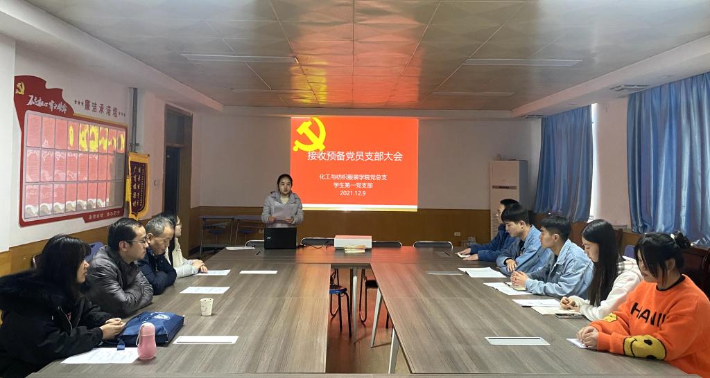 为了进一步健全和完善支部组织建设,增强支部生机与活力,12月9日下午,化纺服学院学生第一党支部在格物楼二楼党员活动室召开接收预备党员支部大会,集中讨论关于呼世伟、赵依迪等5名发展对象为预备党员相关议题。会议由化纺服学院学生第一党支部书记闫琼同志主持,支部委员、入党介绍人及被发展对象参加此次会议。