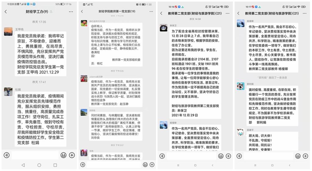 活动中,首先,党总支号召全体党员积极响应学校下发的《致各级党组织和广大党员的疫情防控倡议书》相关要求,提高政治站位,强化疫情防控使命担当,切实发挥党支部战斗堡垒作用,突出示范带动,全面发挥党员干部先锋模范作用,为坚决打赢校园疫情防控阻击战提供了坚强的组织保障。其次,在财经学院党员微信群里,各位党员纷纷表达要落实学院疫情防控工作要求,服从学院部署安排,坚决执行各项疫情防控规定,冲锋在前服务师生。最后,党总支书记孙继龙强调,在抗疫斗争中,要决心服从命令,听从指挥,坚守岗位,冲在一线,危急关头,奋不顾身;发挥党总支的政治核心作用、发挥党支部的战斗堡垒作用、发挥党员的先锋模范作用,让党旗在抗击疫情第一线高高飘扬。