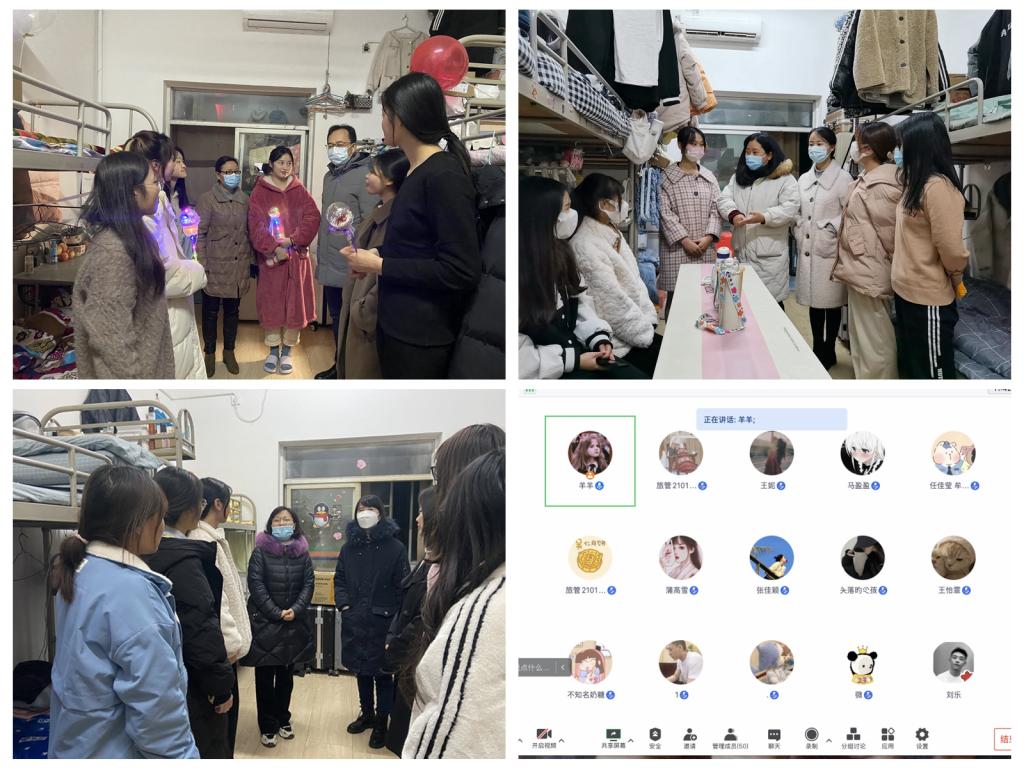 网络传情,营造温馨宿舍环境。因疫情防控不能现场参与此次活动的校外班主任,通过视频会议及录像的方式,向同学们表达新年祝福,同时动员同学们开展“大扫除、抗疫情、见行动、迎新年”宿舍卫生专项整治活动,营造干净、温馨的宿舍环境,用良好的精神风貌,开启新的生活。