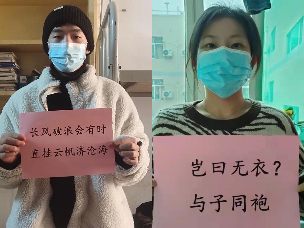 抗击疫情诗词鉴赏。为了给疫情防控提供强大精神动力,辅导员、班主任组织学生搜集与抗击疫情有关古诗词,将诗词中的积极寓意抒发为爱国情,致敬逆行者,传递正能量,特别是对学校、老师、志愿者、一线医护人员的付出表示感谢。该活动传播内容积极、健康、向上,体现了广大学生的精神风貌和责任担当。
