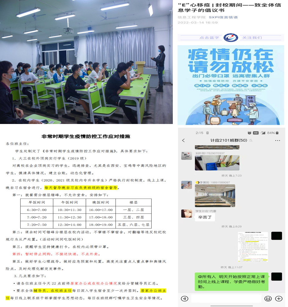 面对当前新冠疫情严峻形势,信息学院严格按照学校防疫工作要求,积极采取多项举措,全力筑牢疫情防控屏障,守护师生的健康,通过主题班会、微信群、班主任进宿舍、公众号宣传等形式,向同学们介绍防疫知识、宣传学校疫情防控相关政策。