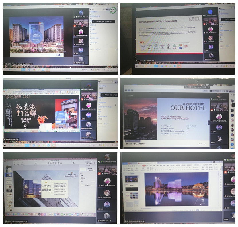 首先,教研室主任郭利娟代表财经与旅游学院和参会学生,对各参会企业表示热烈的欢迎,并对合作企业长期以来支持、配合我院实践育人表示真挚的感谢。随后,西安人民大厦索菲特酒店、西安W酒店、西安丽思卡尔顿酒店、西安印力诺富特酒店、西安金花大酒店、西安中晶华邑酒店和西安徐记海鲜七家校企合作企业的HR代表,通过在线展示、毕业生现身说法、在职员工讲述等多种方式,向同学们展示企业的基本情况、岗位设置、薪资福利、食宿、员工活动等情况,并对同学们提出的各种问题进行了一一解答,消除同学们的实习疑虑。