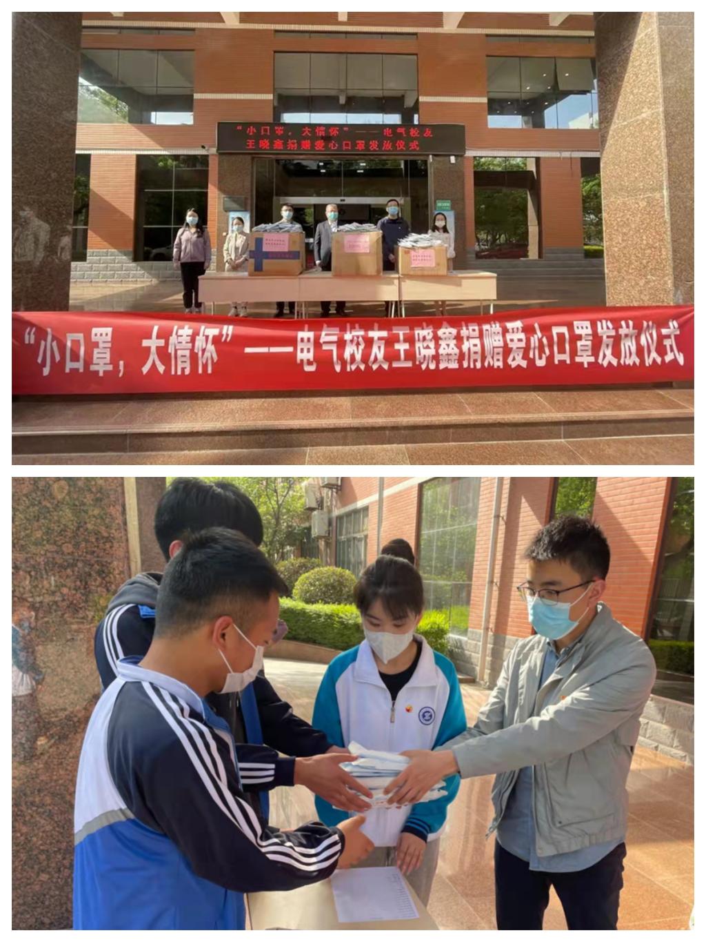 4月7日下午,自动化技术5132班校友王晓鑫同学向电气学院捐赠一次性医药外科口罩10000只,N95口罩50个,助力学院疫情防控工作。电气学院在行知楼A前对20级、21级学生进行爱心口罩发放仪式,党总支书记韩伟、学工办全体辅导员、部分学生代表参加。
