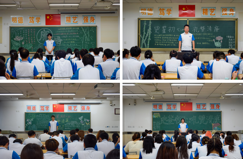 会上,各班同学分享了廉政历史典故、廉政思想和革命先辈的廉洁故事,挖掘故事背后的红色基因和文化传承。首先,同学们讲到将“廉”与政联系起来的第一人是晏婴,他认为廉洁是政治的根本,要提倡选贤任能,这是古代先贤的廉政思想。其次,分享和学习了革命先辈的廉洁故事,如周恩来不准装修会议室,刘少奇教诲子女不搞特殊化,朱德给子女留思想不留厚产等故事,用一个个真实鲜活的故事教育引导同学们理解廉洁文化。