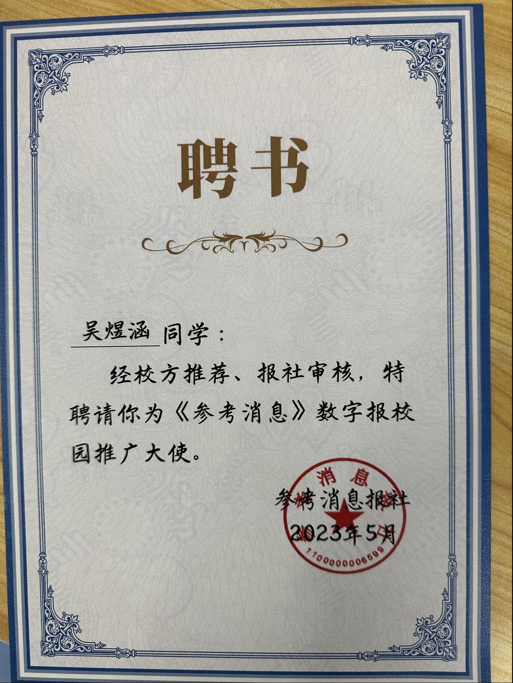 《参考消息》聘任商贸学院吴煜涵同学为校园推广大使