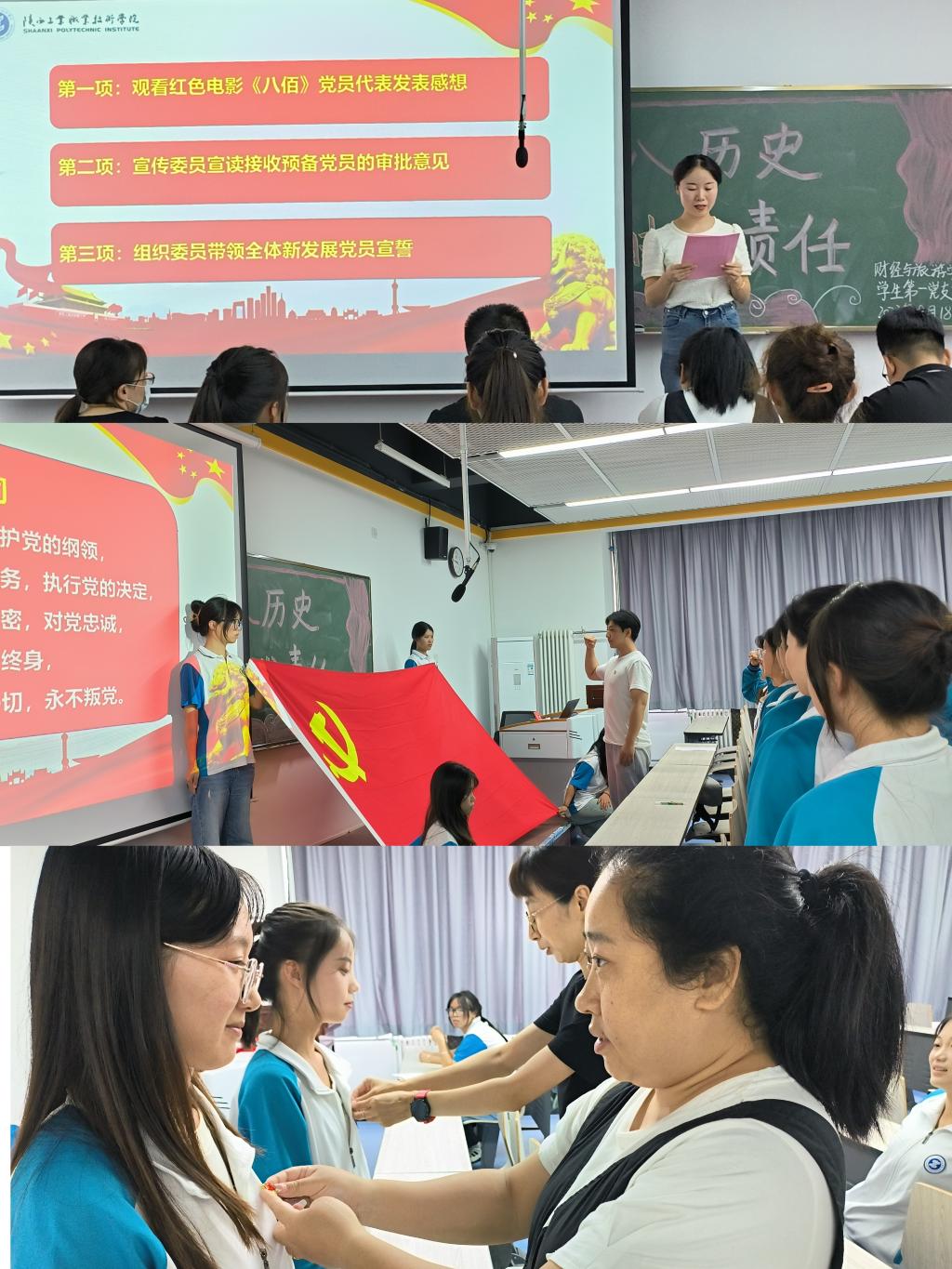 随后,学生第一党支部宣传委员张雪萍老师为大家宣读了接收预备党员审批意见。组织委员陶若老师带领全体新发展党员面向党旗,庄严宣誓。一句句铿锵有力的话语再一次点燃了党员们爱党敬党跟党走的决心。在庄严的宣誓中,接受了一次深刻的党性教育,坚定了广大党员为共产主义奋斗终身的理想信念。此后,学生支部教师党员为2023年度新发展的33名预备党员佩戴党徽。通过佩戴党徽让新党员亮出身份,强化党员意识,树立党员形象。新老接续、传承初心,象征将党员的责任与使命薪火相传,引导新党员增强党员意识,为党旗增彩,为党徽增光。
