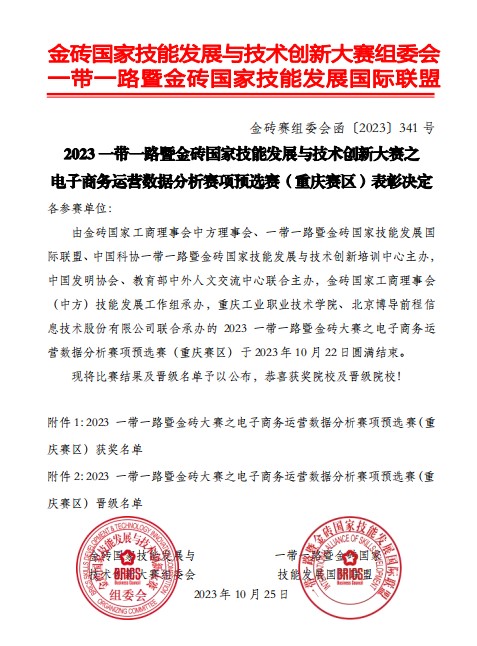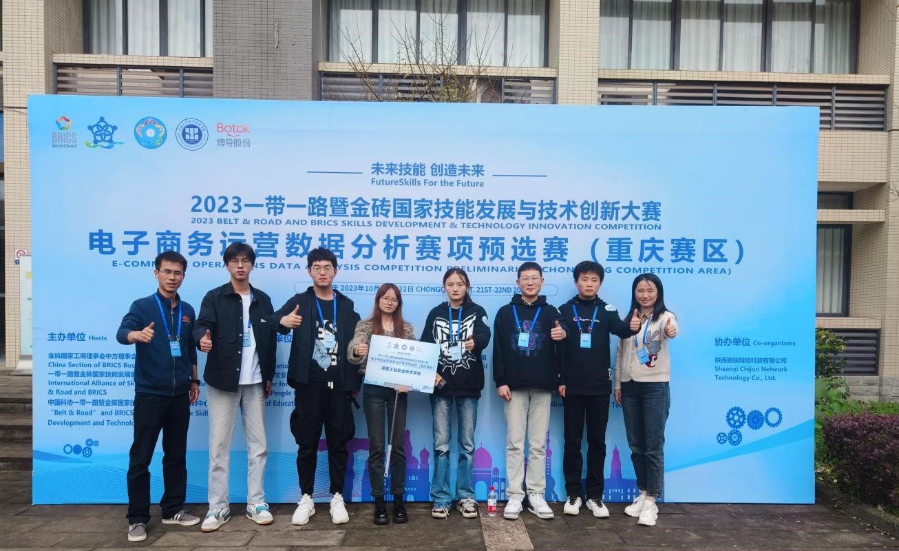 10月22日上午,由金砖国家工商理事会中方理事会主办、重庆工业职业技术学院承办、北京博导前程信息技术股份有限公司协办的2023一带一路暨金砖国家技能发展与技术创新大赛电子商务运营数据分析赛项(简称“电子商务运营数据分析赛项”)预选赛落下帷幕。共有来自10各省份,42支队伍参与本次预选赛。由我院教师李婷老师指导的商务师数据分析与应用专业刘皓阳、张烜赫、党洁3名同学组成的代表队获团体二等奖,并晋级总决赛;刘宇哲老师指导的商务师数据分析与应用专业王莞琳、刘力、王佳乐3名同学组成的代表队获团体三等奖。