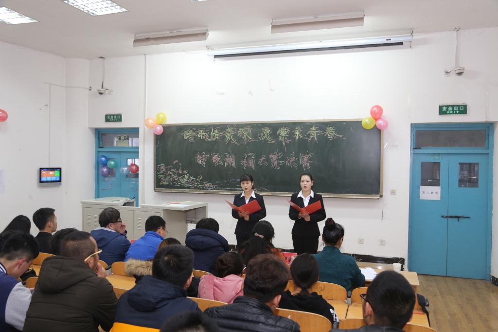 12月5日下午,由团委主办,工商管理学院承办的陕西工院“诗歌情谊深·愿党永青春”诗歌朗诵大赛决赛在崇文西楼举行,王金省、钟晓书、刘刚、袁夏莹和郭晓莹应邀担任评委,近200名师生参加了本次活动。