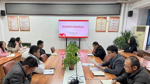 会上,许冀阳副院长领学了《教育部公开曝光第十三批7起违反教师职业行为十项准则典型案例》。7起典型案例涉事教师均已受到严肃处理,反映出各地各校在深入贯彻落实教师职业行为十项准则要求、加强教师思想政治和师德师风建设工作中,始终把师德师风作为评价教师队伍素质的第一标准,亮明对师德违规“零容忍”、严惩师德违规行为的坚定态度。