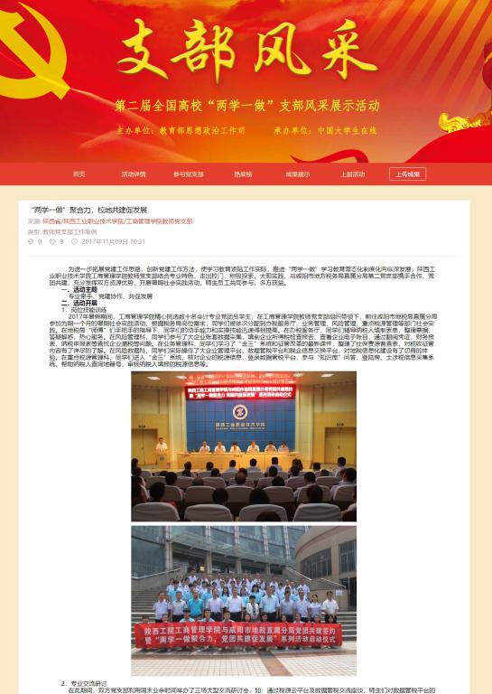 近日,由教育部思政司主办的第二届全国高校“两学一做”支部风采展示活动在中国大学生在线网站进行集中展示,全国共有2860所高校的3688个党支部参与其中。我院工商管理学院党总支教师党支部的《“两学一做”聚合力,校地共建促发展》案例光荣入选参评。