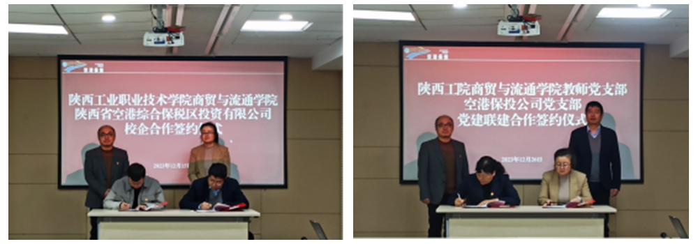 一行人首先在企业领导陪同下,参观了空港综合保税区沙盘区,并听取详细介绍,了解了空港综合保税区的核心位置与经济发展的战略定位。随后,张磊总经理对陕西省空港综合保税区投资有限公司的基本情况进行了详细说明,并表示,空港保投公司作为西咸新区空港新城管委会下属的大型国有独资企业,在临空、自贸、保税、口岸、跨境、航权等方面具有独特的优势,与陕西工业职业技术学院开展党建联建,能够有效增强党组织组织力、凝聚力、战斗力,对深化校企合作,加快实现校企党建工作优势互补、良性互动,开创校企党建工作合作新格局都能够起到极大的促进作用。蒋鹏书记介绍了商贸与流通学院的发展现状,并指出,开展校企党建联建活动,不仅能够促进党建工作经验的交流,同时,企业党员与教师党员的深入交流能够更好地推进专业建设,并在人才培养、实训室建设、就业创业、社会服务、企业技术骨干培养等多个方面互促、互利、互赢,真正形成党建和业务“双融合、双促进、双提升”高地。