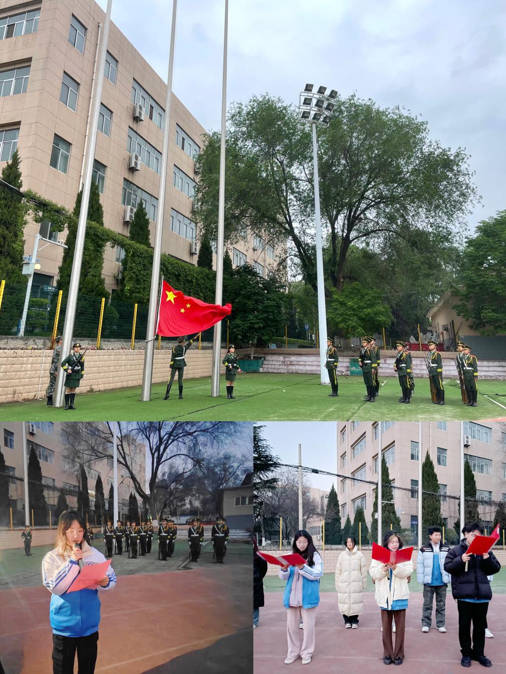 7点整,在激昂的旋律中,国旗护卫队迈着坚定的步伐来到升旗台下,五星红旗伴随着《义勇军进行曲》徐徐上升,全体师生肃立凝视,深怀对党和国家的无限热爱和崇高敬意。