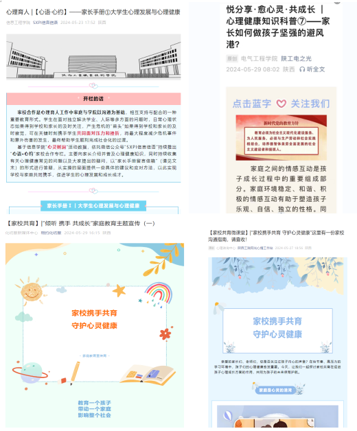 家庭教育主题宣传周期间,学生处心理咨询中心录制“云端携手,聚力同行家-校共育云端大课堂”两节微课视频,各二级学院通过线上转发的方式发放至我校学生家长,视频累计播放量达万余人次。同时,各二级学院围绕“倾听 携手 共成长”主题,通过主题班会、公众号科普、微视频录制、心理征文、电话家访等方式积极开展了本次家庭教育主题宣传周活动。