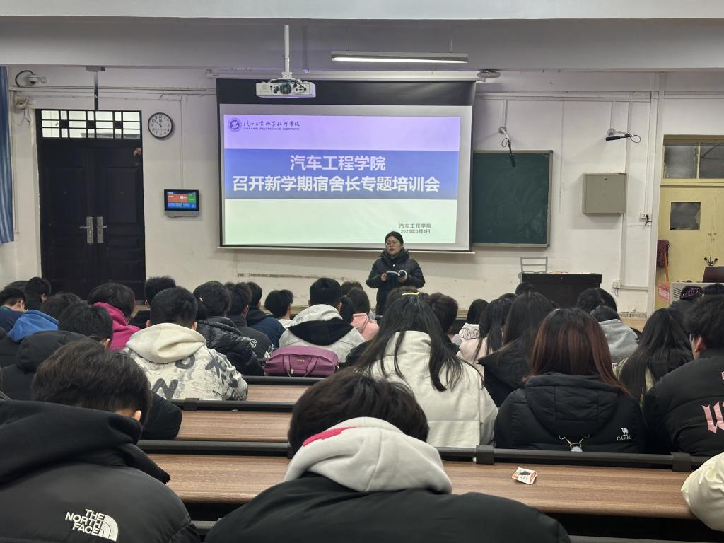为进一步加强学生宿舍管理,提升宿舍长的责任意识与工作能力,营造良好的宿舍环境与学习氛围,3月4日,汽车工程学院在崇文北楼阶梯教室二召开了新学期宿舍长专题培训会。学工办全体辅导员及100余名宿舍长参会。