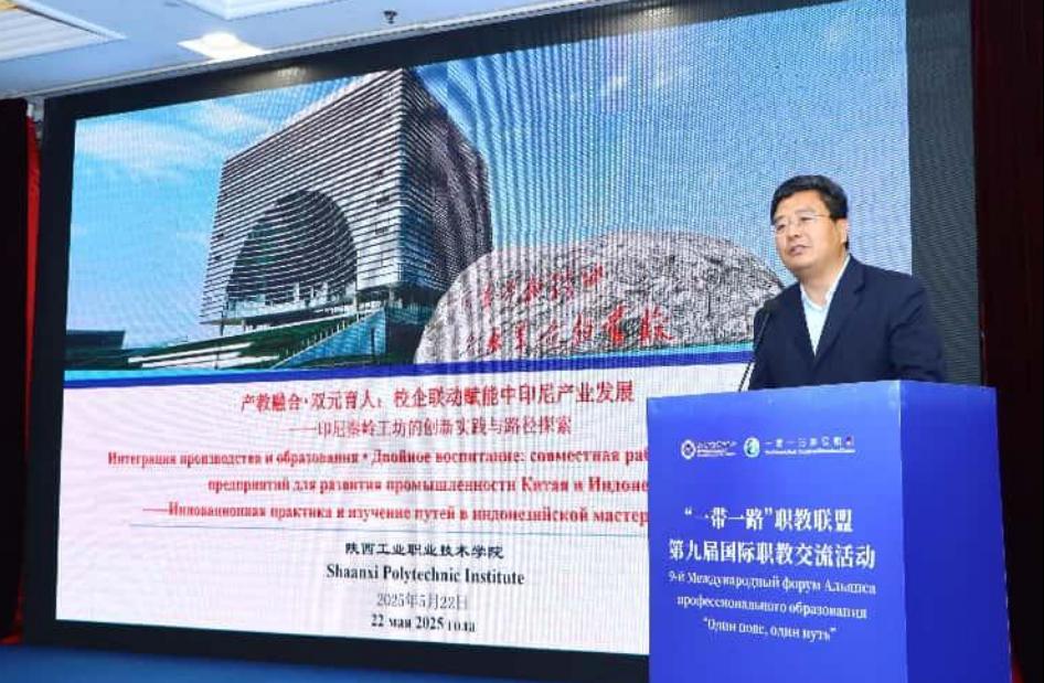 5月22日,由陕西省教育厅主办的“一带一路”职教联盟第九届国际职教交流活动在西安隆重举行。省委教育工委副书记、一级巡视员王海波受邀出席活动并致辞。我校国际教育学院院长秦景俊在会议上作了题为《产教融合·双元育人:校企联动赋能中印尼产业发展》的专题交流发言,系统介绍了我校在印尼“秦岭工坊”建设中的创新实践与成果经验,为职业教育国际化发展提供了新思路。