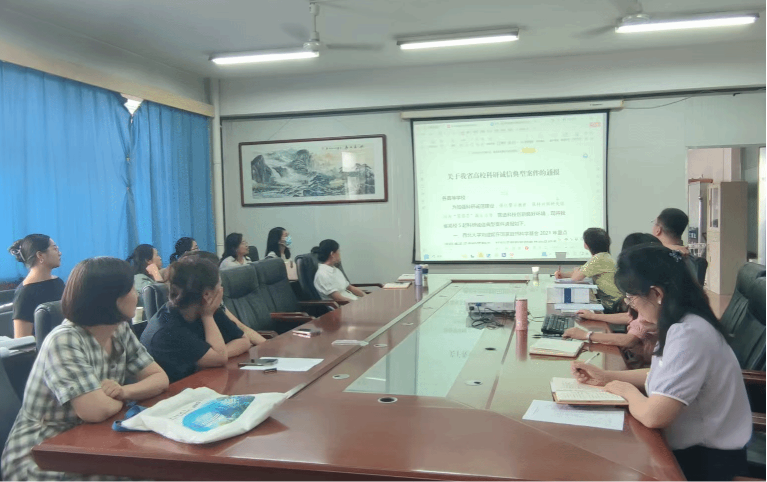 接下来,刘迪院长带领大家学习了《关于我省高校科研诚信典型案例的通报》文件,通过了解某高校教师因数据造假被撤销项目、取消职称的典型案例通报,教育提醒全体教师一定要遵守科研诚信要求,严格要求自身行为。