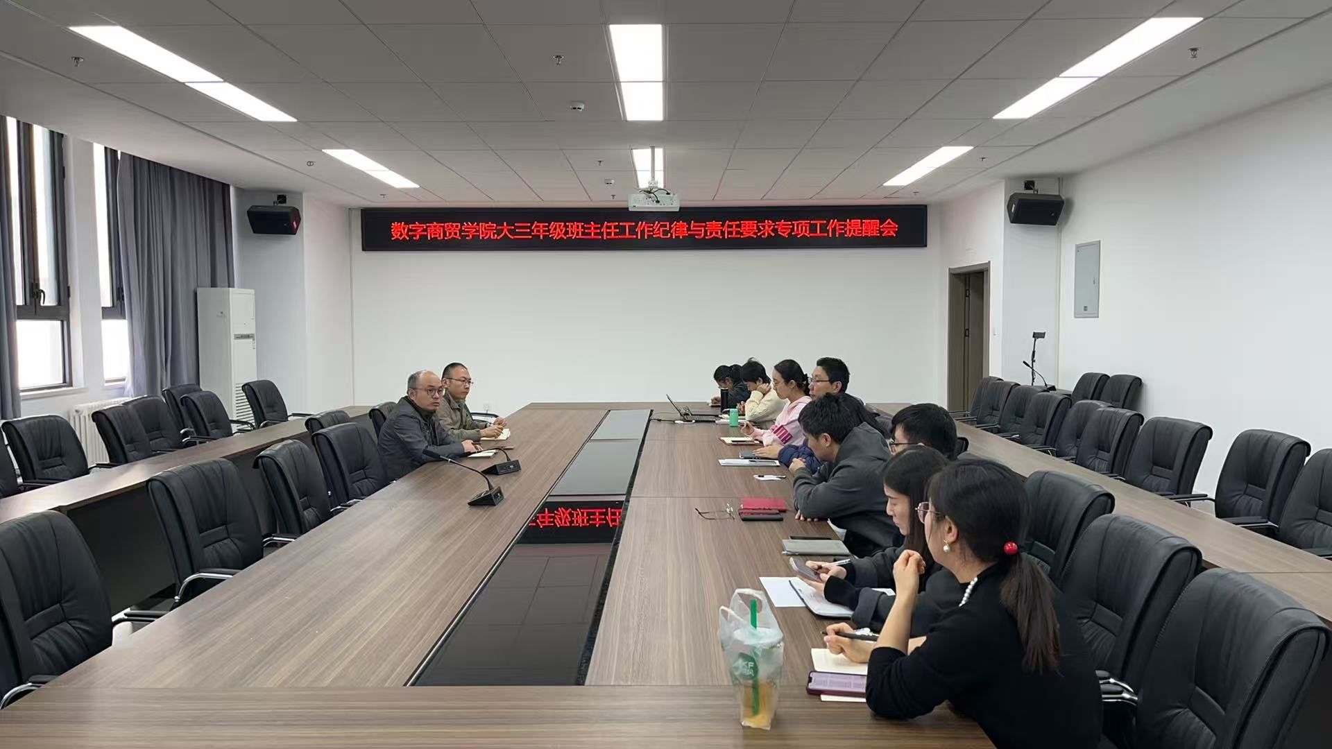 随后,全体与会人员共同重温教育部高校就业工作“四不准、三不得” 文件精神,结合高校毕业季典型工作案例开展专题研讨。针对毕业阶段学生易出现的实习安全隐患、升学就业焦虑、心理状态波动等问题,参会人员集体梳理风险防控重点环节,明确应急处置流程与工作标准。针对此前工作中发现的记录不规范、沟通不及时等问题,商贸学院正式推出“周通报”工作机制,以常态化督查倒逼工作落实,用严格纪律约束提升工作质效,推动毕业生工作形成闭环管理。
