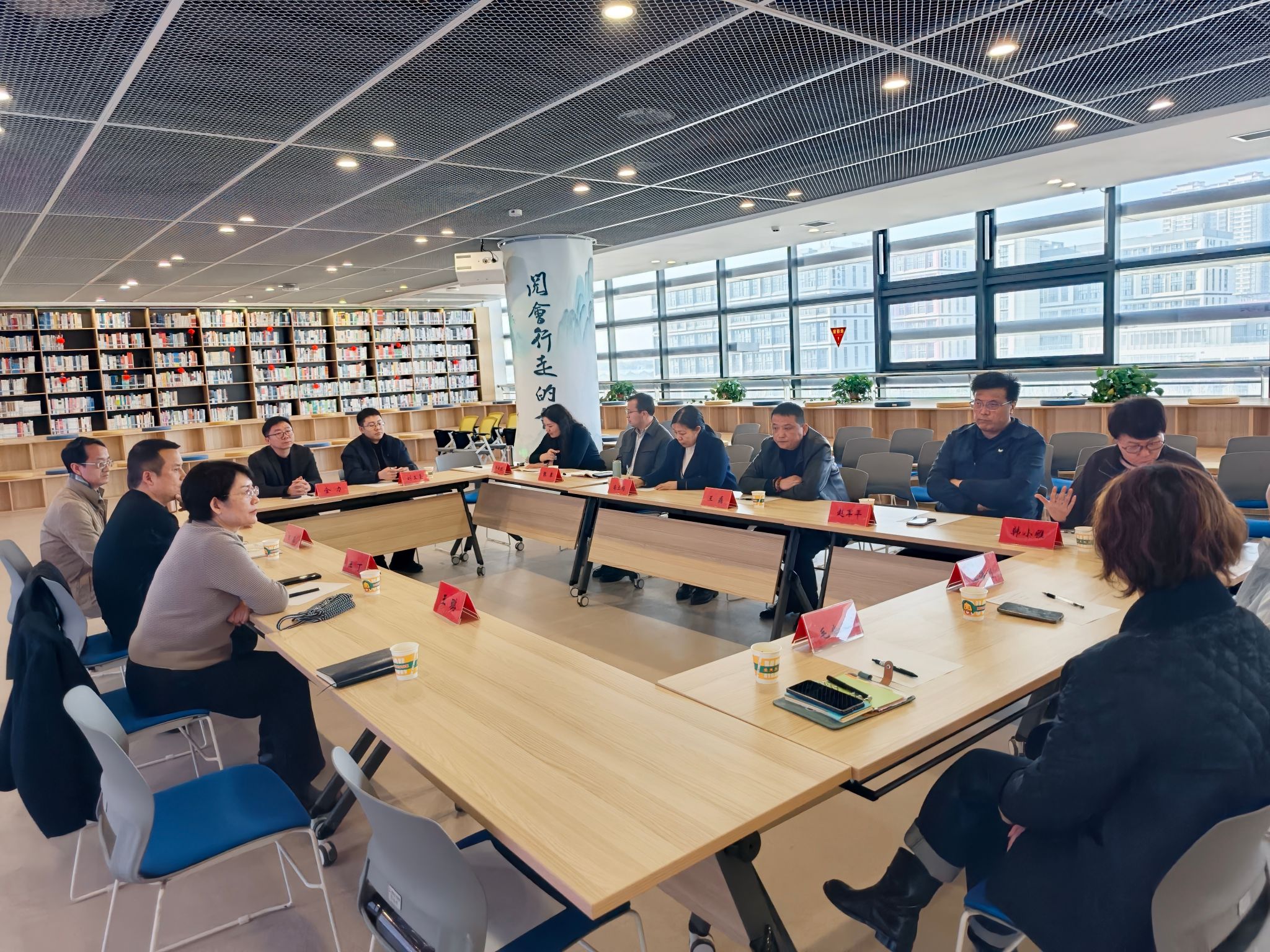 参观结束后,双方在图书馆三层研习空间召开专题交流会,聚焦阅读课程开发、建设与管理等内容展开深入探讨。会上,王丁馆长详细介绍了我校图书馆阅读推广工作的整体规划、特色活动开展情况,以及阅读课程开发的初衷与理念;图书馆王璐老师介绍了《百本名著导读课程》的设置、考核方式、学分评定方式等,分享了课程建设过程中的经验与心得。