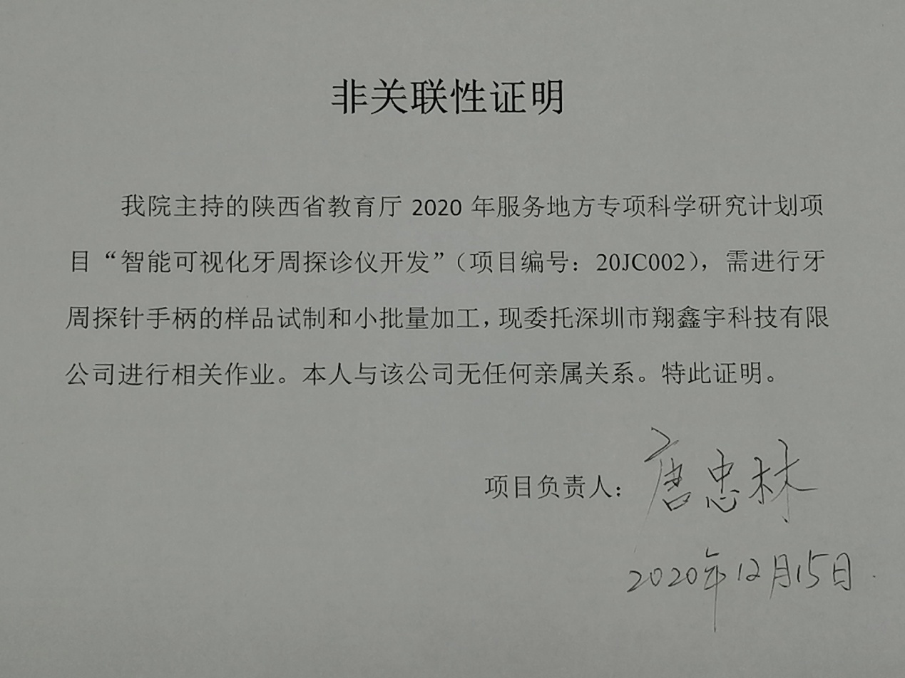 我院航空工程学院唐忠林老师科研团队承担的陕西省教育厅2020年服务地方专项科学研究计划项目“智能可视化牙周探诊仪开发”(项目编号:20JC002),拟申请牙周探针手柄的样品试制和小批量加工,按照《陕西工业职业技术学院教科研项目经费管理办法(试行)》(陕工院院字(2020)32号)文件要求,现将信息公示如下。