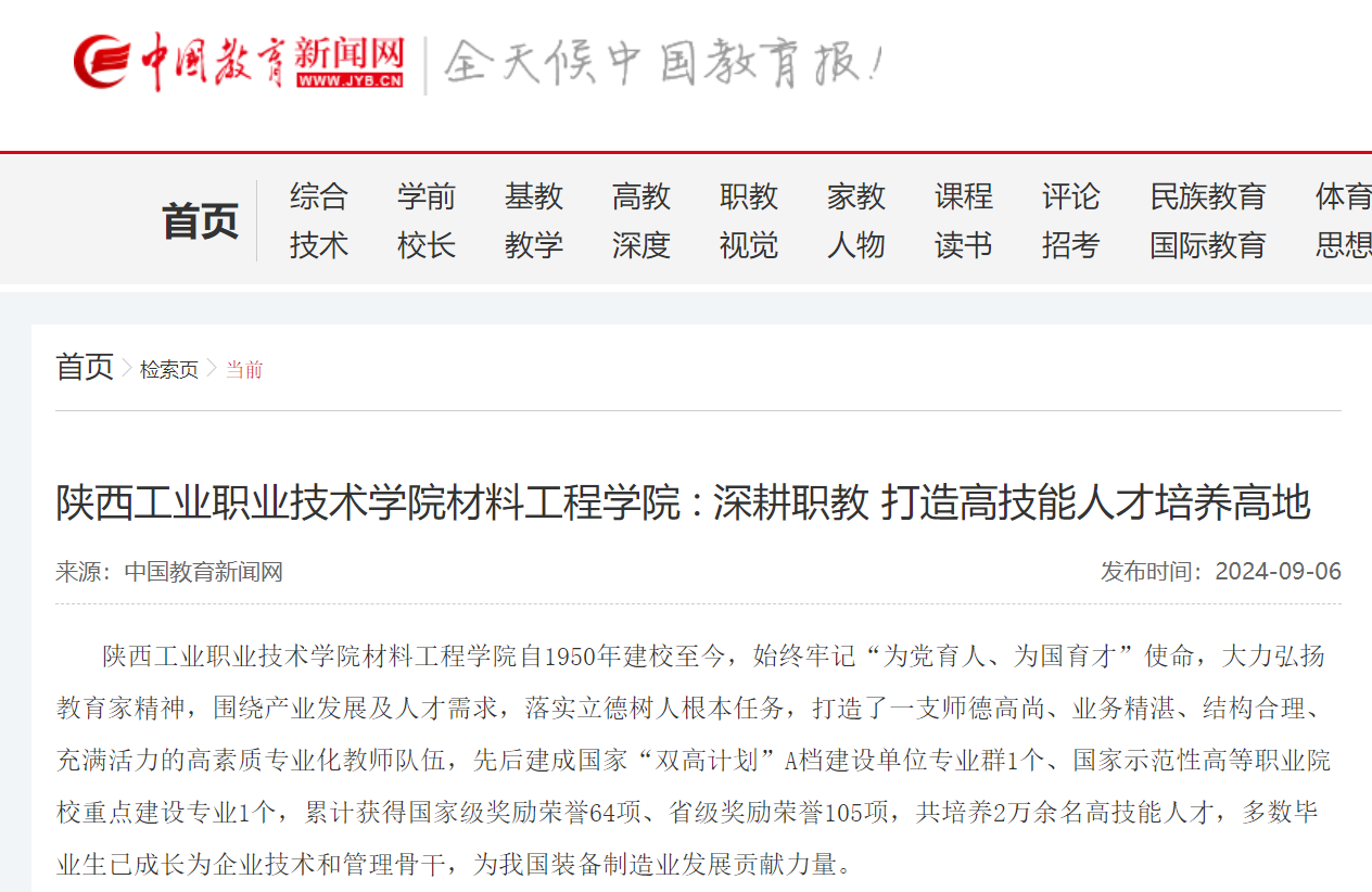 陕西工业职业技术学院材料工程学院自1950年建校至今,始终牢记“为党育人、为国育才”使命,大力弘扬教育家精神,围绕产业发展及人才需求,落实立德树人根本任务,打造了一支师德高尚、业务精湛、结构合理、充满活力的高素质专业化教师队伍,先后建成国家“双高计划”A档建设单位专业群1个、国家示范性高等职业院校重点建设专业1个,累计获得国家级奖励荣誉64项、省级奖励荣誉105项,共培养2万余名高技能人才,多数毕业生已成长为企业技术和管理骨干,为我国装备制造业发展贡献力量。