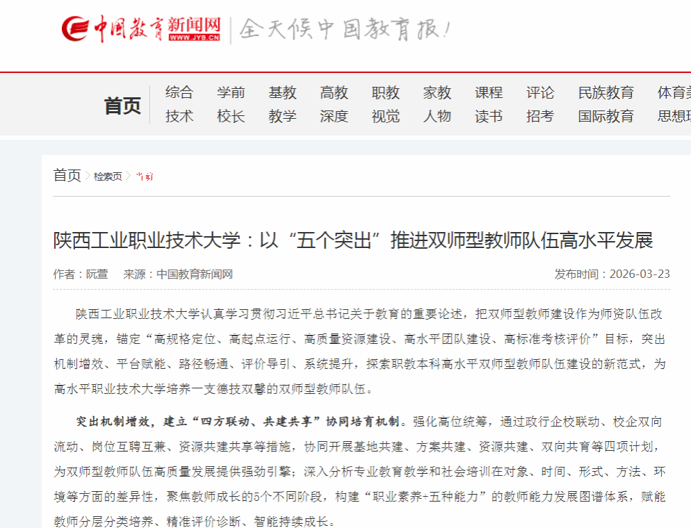 中国教育新闻网:陕西工业职业技术大学以“五个突出”推进双师型教师队伍高水平发展