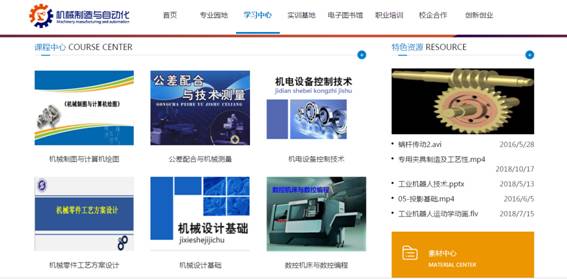 “职业教育机械制造与自动化专业教学资源库”是2016年7月正式获批立项陕西省高等职业教育专业教学资源库建设项目(陕教高办〔2016〕30号,项目编号:GZ-1603)。建设有专业教学、职业培训与社会服务、专业拓展三大类资源,包括专业建设园地、学习中心、校企合作、创新创业、实训基地中心、职业培训、图书馆等共七个子库资源。涵盖机械设计与制造专业,辐射精密机械技术、机电设备维修与管理等三大专业群。采用数字化虚拟现实技术,开发优质教学资源;建成了10门专业主干课程、搭建了20门个性化学习课程、制作微课200个以上、资源库素材总量达10000条以上。通过现代信息技术、网络技术,实现"能学、辅教"即导学、导做、辅教、助训、可评等五大功能,优质教学资源共建共享。是集资源检索、信息查询、资料下载、专业教与学、企业员工技能提升、就业创业者培训和教育等功能于一体的数字化、开放式、共享性、专业学习与服务平台,为职业院校教师教学、企业职工培训、学生和社会学习者自主学习服务。