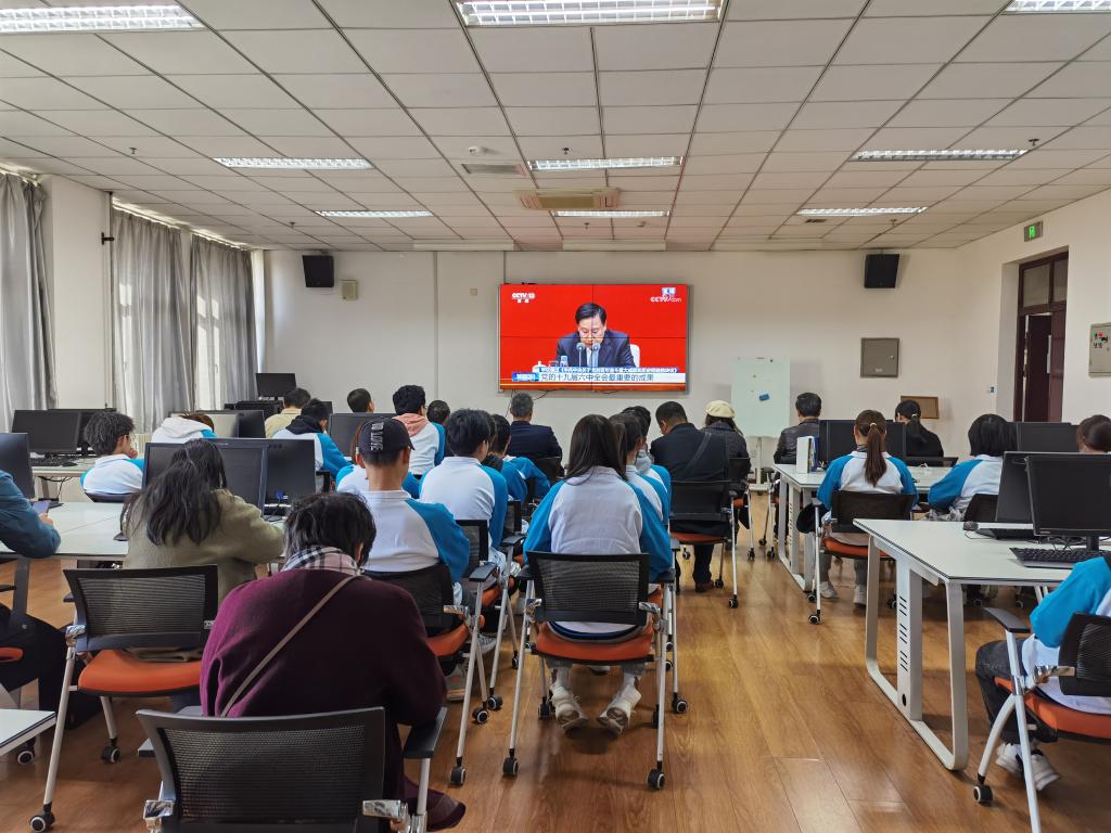 航空工程学院党总支组织师生于精艺楼3015观看“介绍党的十九届六中全会精神”新闻发布会直播。观看现场,全体师生认真聆听学习,领会全会精神的丰富内涵与核心要义,并表示,今后将继续深入学习习近平总书记重要讲话和全会精神,切实用全会精神武装头脑、指导实践、推动各项工作高质量完成。