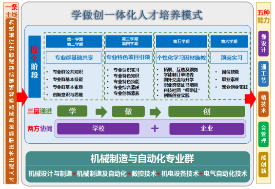制造业的转型升级对人才提出了更高的要求,目前技术技能人才培养存在供需不完全一致的结构性矛盾,深化产教融合、建设校企命运共同体、探索校企协同育人机制、创新人才培养模式是解决问题的有效途径。陕西工业职业技术学院机械制造及自动化专业群聚焦制造业数字化转型,对接数字化精密制造产业发展,通过与行业龙头企业北京精雕共建产业学院,形成了校企协同育人机制,创建了“教、学、做、创”一体化人才培养新模式。