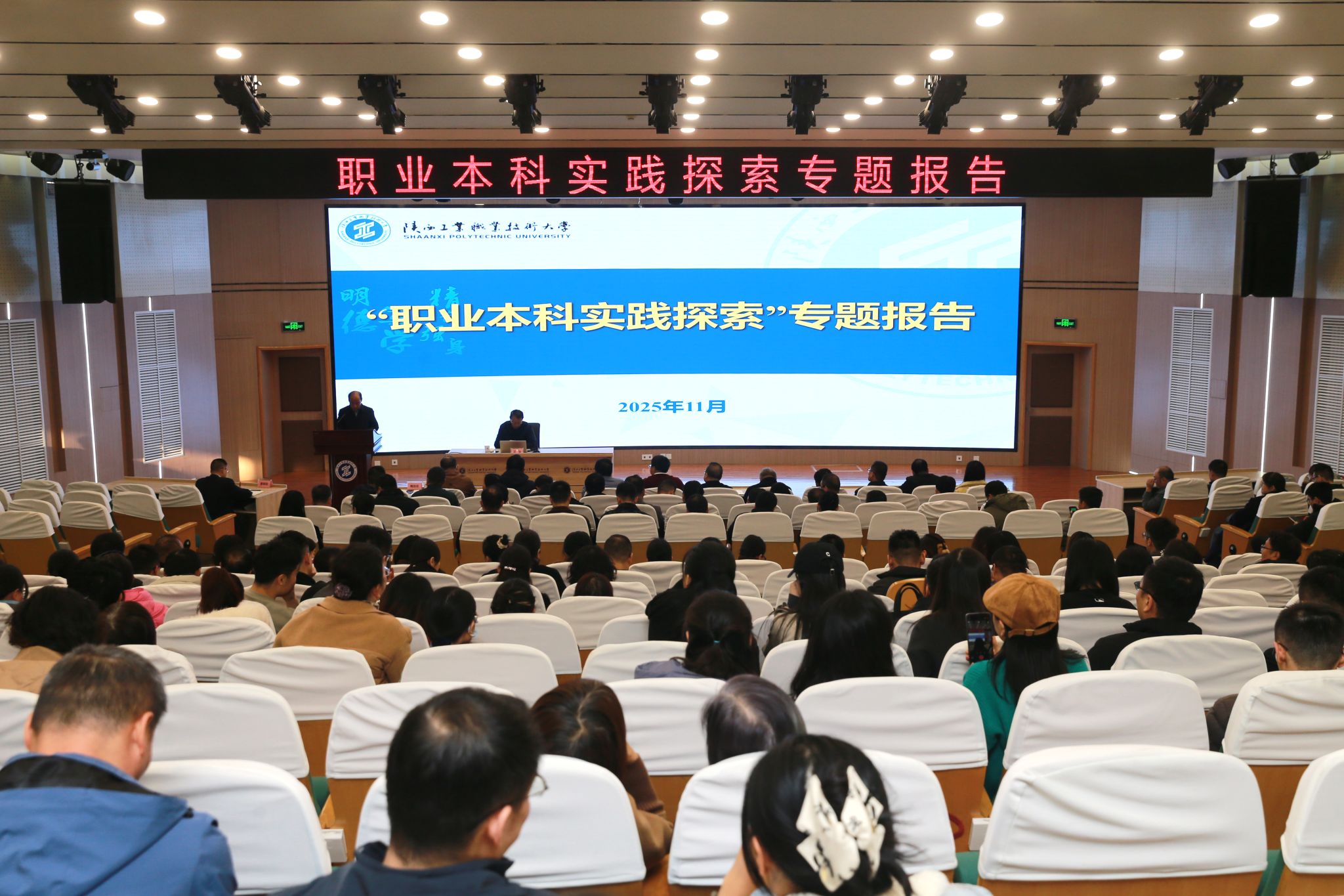 11月25日下午,我校在渭城校区学术会堂召开“职业本科实践探索”专题报告会。深圳职业技术大学二级教授汪治受邀作题为“职业本科学校基本办学定位体系与深圳职业技术大学的实践探索”专题报告,党委书记惠朝阳,教学系统处科级干部、教研室主任及专业带头人等300余名教师代表参会,会议由副校长梅创社主持。