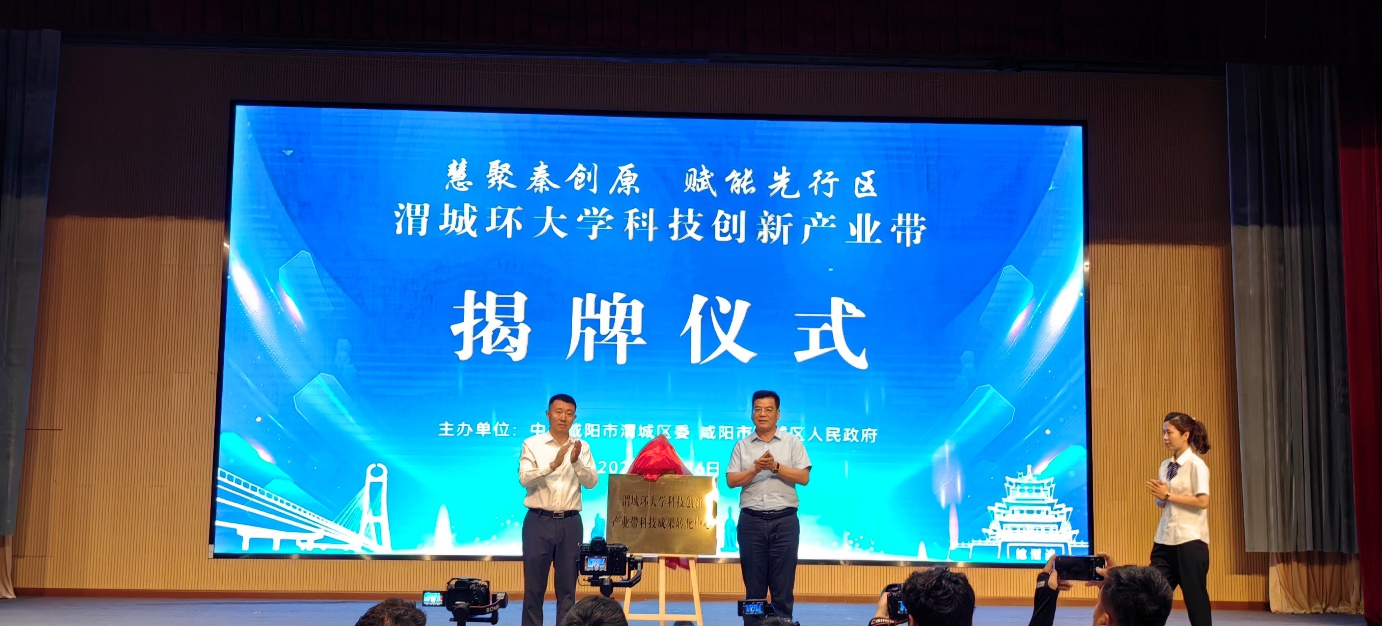 图2 咸阳市市委副书记贾珉亮和陕西工业职业技术学院刘永亮校长为“渭城环大学科技创新产业带科技成果转化中心”揭牌