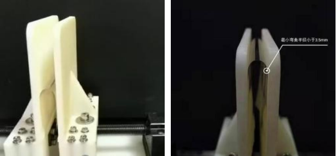 2019年,团队成员以专利转让、技术支持等方式组建了国内第一个柔性玻璃热拉工厂,开发出国内自主知识产权柔性玻璃料方AMZ-6,及最为关键的核心成形设备:铂铑合金板根成型器、梯度温控炉、多层变速夹持装置等装备,打破核心设备技术垄断。成功拉制出120μm、100μm(图2)、80μm、50μm多档次厚度的柔性玻璃,实现最长300mm切割,最小弯曲半径3.5mm(图3)。该成果获得国内多位专家认可,并在央视二套、教育频道、中国教育报等多家媒体报道。