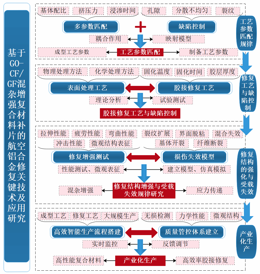 图1 GO-CF/GF混杂增强复合材料修复航空铝合金关键技术研究内容及相互关系