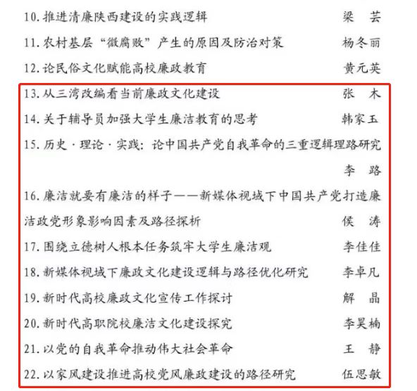 近日,陕西省廉政文化研究会公布了《关于2022年廉政文化建设征文获奖论文的表彰决定》,我校共有21项作品获奖,其中信息工程学院党总支薛昊、机械工程学院党总支张亦乐荣获二等奖,梁琳琳等9位教师荣获三等奖;张木等10位教师荣获优秀奖。学校荣获优秀组织奖。