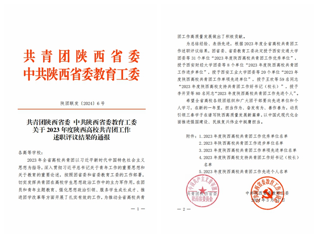 2023年,学校共青团在校党委和上级团组织的坚强领导下,坚决贯彻落实习近平总书记和党中央重要决策部署,认真谋划、深入开展团员和青年主题教育,引导团员和青年认真学习领会习近平新时代中国特色社会主义思想,更加深刻领悟“两个确立”的决定性意义,切实增强做到“两个维护”的思想自觉、政治自觉、行动自觉,立志做有理想、敢担当、能吃苦、肯奋斗的新时代好青年。按照团省委和省委教育工委的工作部署,在强化思想政治引领、服务学生成长成才、推进团学组织改革等方面开展了扎实有效的工作。收到团中央感谢函一封,荣获2023年陕西省大中专学生志愿者暑期文化科技卫生“三下乡”社会实践活动“省级示范学校”、第十四届“挑战杯”陕西省大学生课外学术科技作品竞赛“优秀组织奖”、第四届陕西高校团干部素质能力大赛“优秀组织单位”等国家级、省级荣誉五十余项。